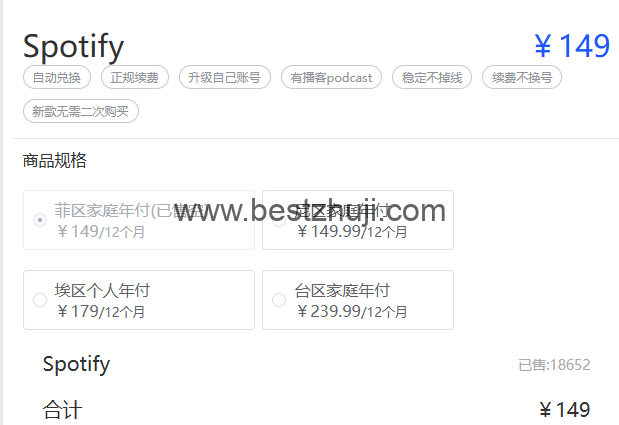 目前全网价格最低,尼区个人年付近需149元,该平台除了Spotify合租服务之外,还提供Spotify代注册服务,自助充值,全程无需客服操作,无需国外网络(使用国内网络就可完成充值)!任何地区账号都可拍,充值后账号将被切换到购买地区。