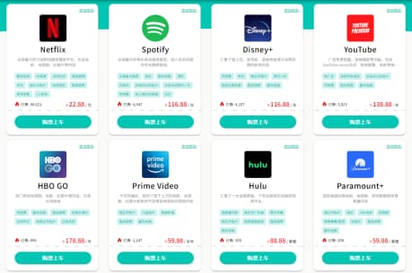 官方除了提供 Spotify 合租外,也提供 Netflix(奈飛)、Disney+(迪士尼+)、Youtube Premium(油管會員拼車)、HBO GO、Apple One、iCloud+、Prime video、TV伴侶、Paramount+ 等流媒體賬號的合租,Spotify目前這個平台價格沒有價格優勢,其它產品的價格還是很便宜,其它產品還是可以通過這個平台合租發車的。